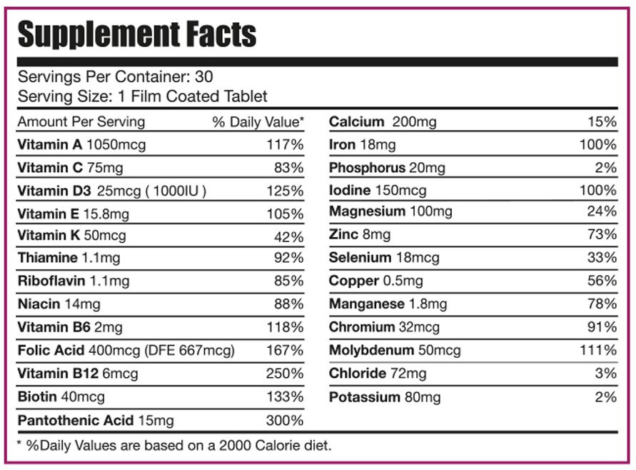 It contains 26 elements of the most important vitamins and minerals that the body needs on a daily basis, such as vitamins A, B, C, D, E, K, and minerals such as calcium, iron, zinc and chromium
