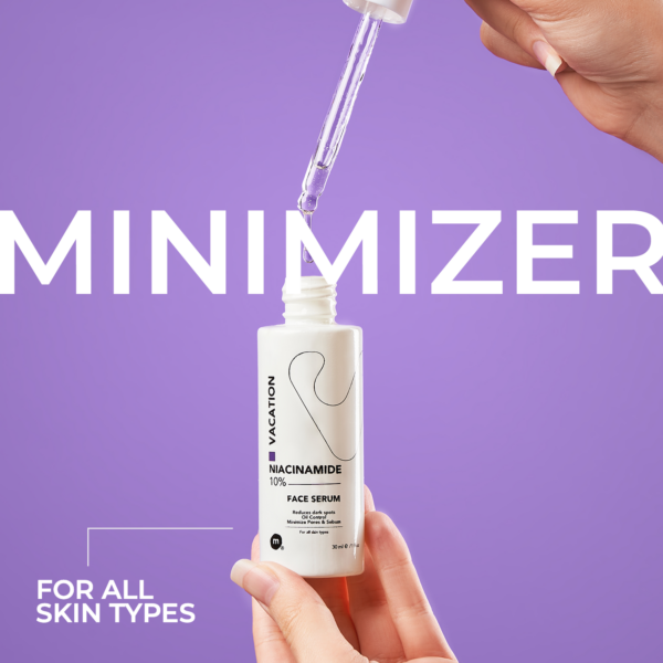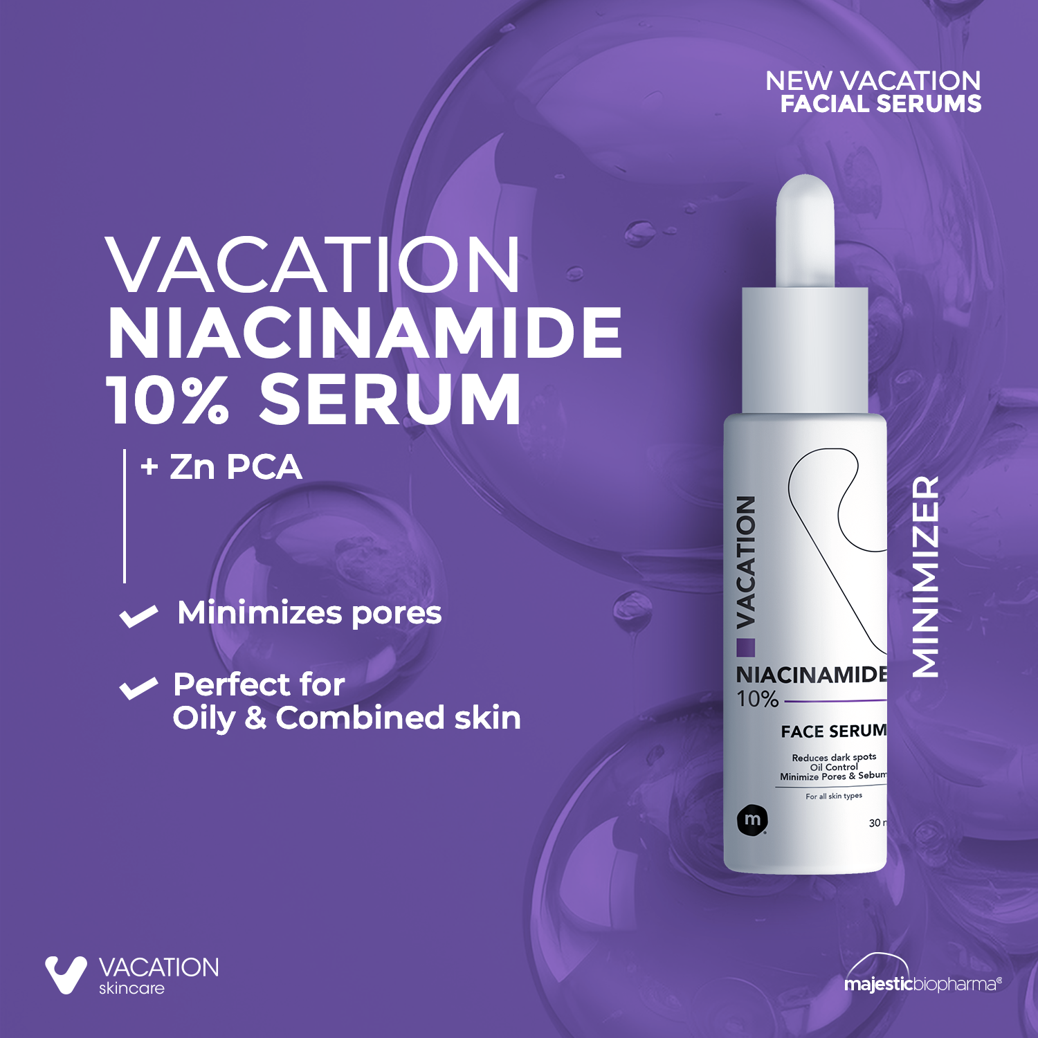 Unleash the power of Zinc PCA with the Vacation Niacinamide Serum! This powerful formula effectively combats blackheads, minimizes pores, smoothens texture, and controls oiliness, making it the ultimate serum for minimizing wide pores and balancing sebum production. Experience a flawless complexion with visibly clearer, healthier skin.